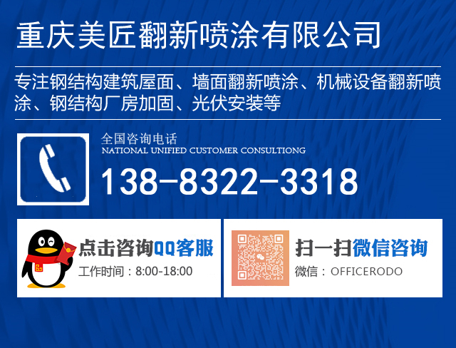 重庆美匠翻新喷涂有限公司是一家专注于翻新喷涂领域的企业,集材料研发、销售、施工为一体的专业化公司。公司产品通过了ISO9001、ISO14001质量管理体系认证。主要系列产品有:反辐射隔热涂料、水性金属防锈漆、彩钢瓦专用翻新漆、铁锈转化剂等。 公司拥有专业的施工人员80余名,其中3人拥有高级技术职称,拥有先进的喷涂技术及成套的自动化设备。致力于为客户提供高质量的翻新服务。业务涵盖钢结构建筑屋面、墙面翻新…